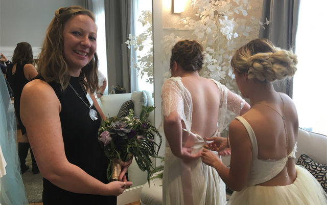 Bec Koop, COO of the Cannabis Wedding expo, poses with the bridal cannabis bouquet she designed as owner and founder of Buds and Blossoms.