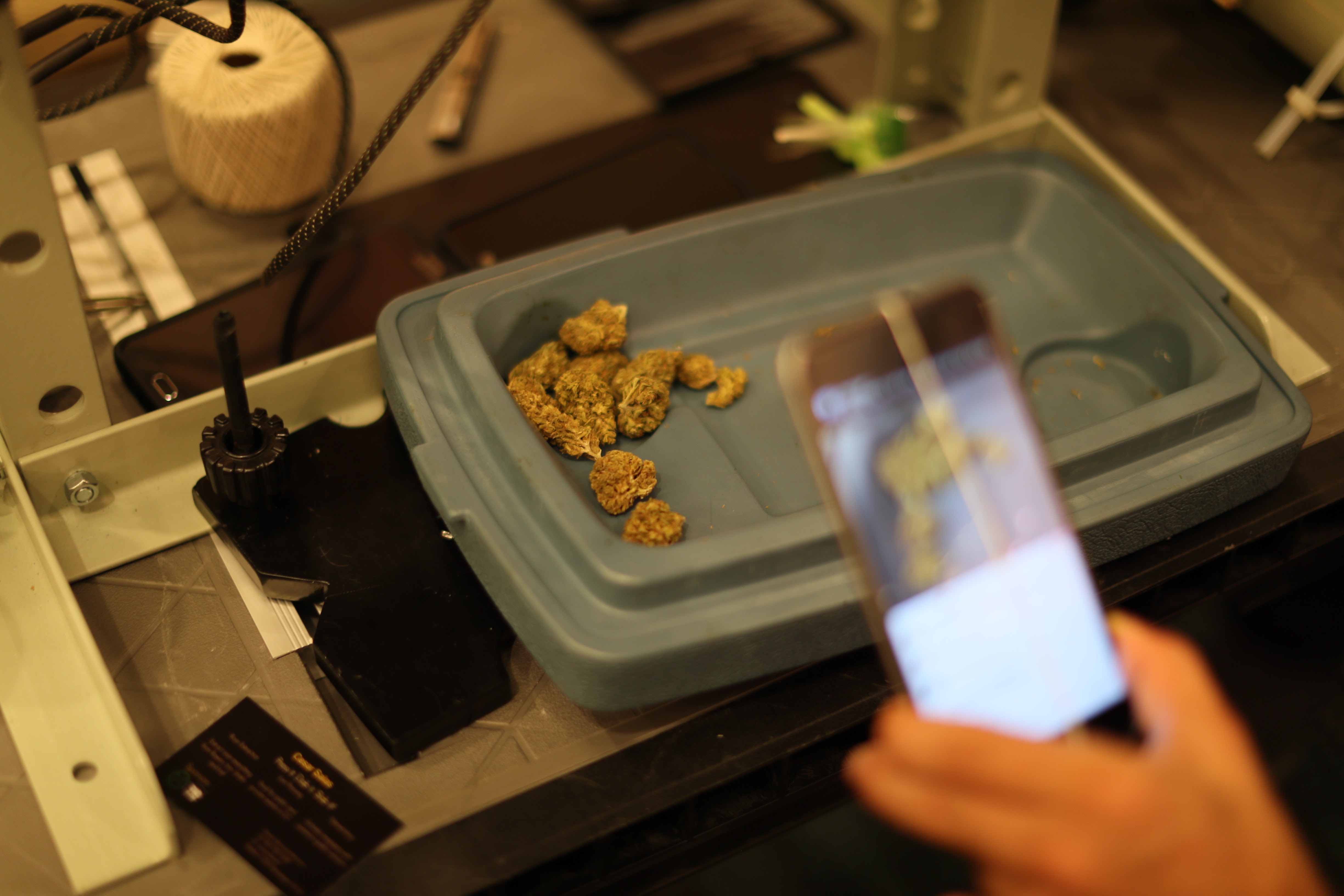 The leftover plant matter from the rosin tech process looks and feels much like a kale chip. Instead of discarding the flower, RosinStein experiments with ways to reuse the by-product. Here, the pressed flower is put on display in a photo frame as a keepsake.