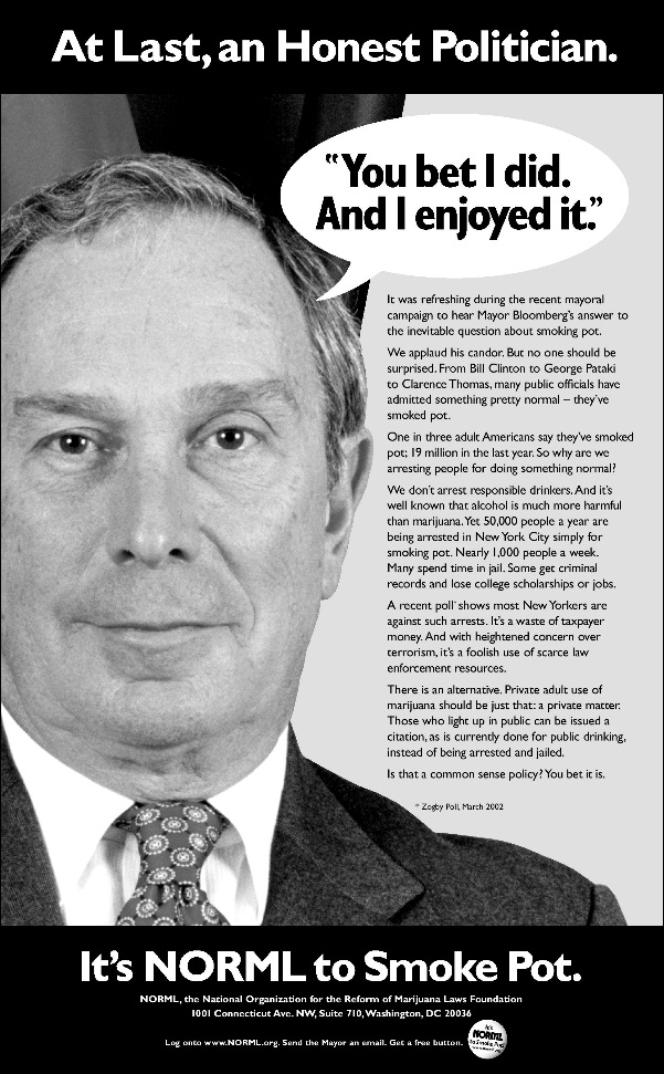 NORML founder and Executive Director Keith Stroup explained the reason his organization used the image of the mayor on buses and took out ads in the New York Times was to equalize policing policies. “We’re not asking Mayor Bloomberg to change the law, “We’re simply asking him to end the double standard by which ’open container’ violations are handled with a ticket and a fine, while ’open smoking’ results in arrest and jail.”