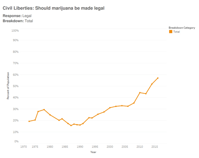 A recent poll released by the General Social Survey reveals 57 percent of Americans think the use of marijuana should be legal. That’s up from 52 percent in 2014.