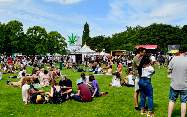 On June 11th, 2017 Amsterdam hosted the 9th Cannabis Liberation Day. Thousands of cannabis enthusiasts and cannabis-curious folks gathered under glorious sun – and a ginormous cannabis leaf – in the beautiful Flevo Park for the annual free festival. Police presence was minimal – I only saw one policeman all day, and even then, he was in a street neighbouring the park and not actually on the park grounds.