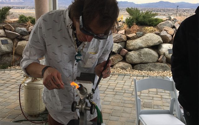 An artist from DBK Glass Creations demonstrates how to blow glass, live at the Falls Event Center.