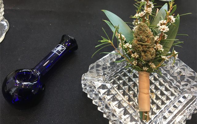 Smoke-able art from My Bud Vase, placed on tables gives guests a pretty and discreet smoking vessel made of antique vases.