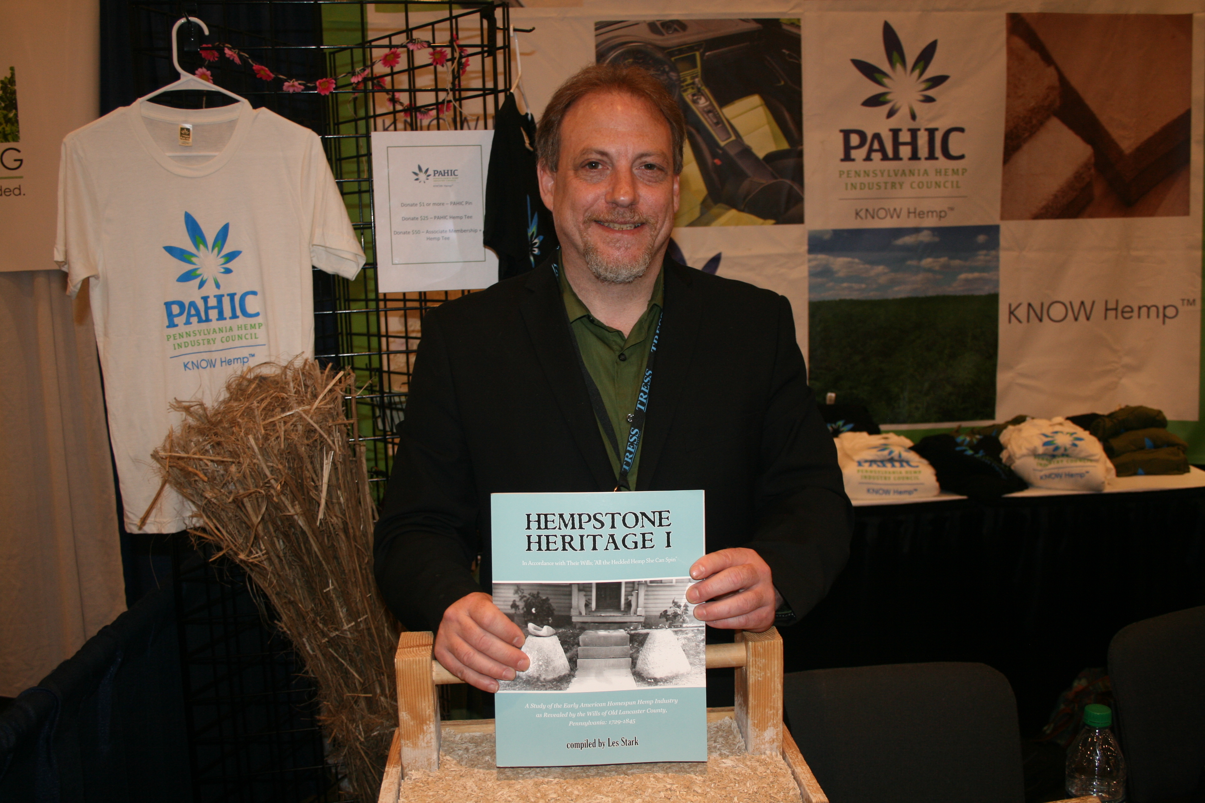Hemp historian, Les Stark, holds up his new book on the history of hemp in Pennsylvania titled, Hempstone Heritage. Currently, the Keystone state is fighting for the right to once again grow hemp post-prohibition.