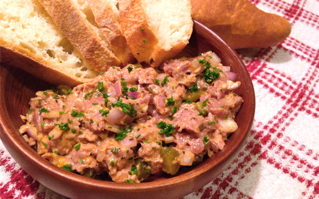 Combine all liquid ingredients and spices in a small bowl and whisk together. In a large bowl, combine liquids with meat, gherkins and shallots. Use the back of a large metal spoon to press down against the sides of the bowls and tenderize with a smearing motion for about 3 minutes. Serve immediately.