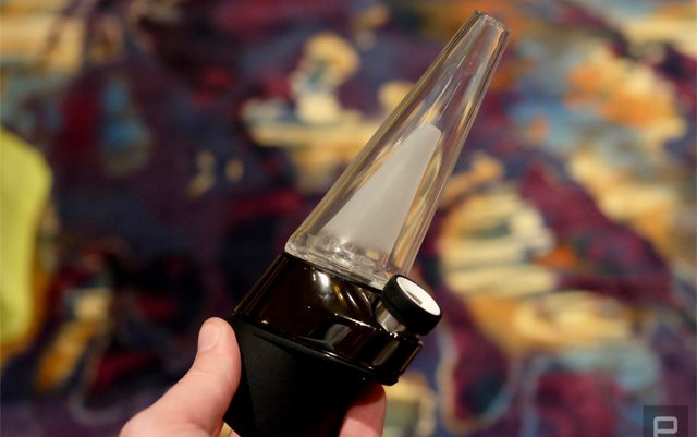 The Puffco Peak is reviewed and has a unique, pyramid-like shape. It is 7 inches tall with a base of about 2.75 inches, which makes it very efficient and highly portable. It has a battery that takes approximately 2 hours to fully charge and it lasts for about 30 hits – making it very convenient when sharing.