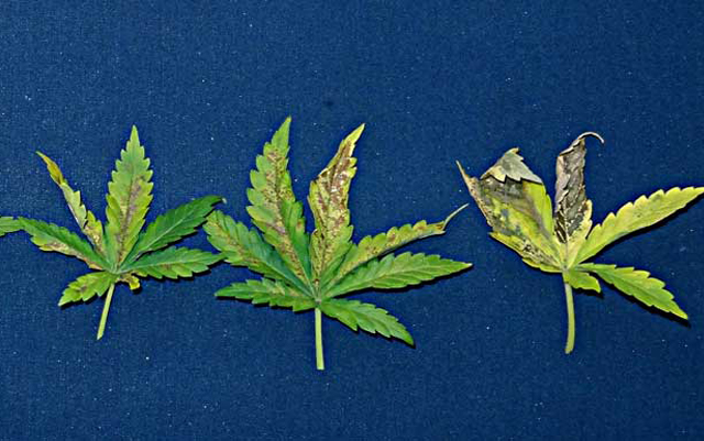 Like nitrogen, phosphorus is considered “mobile” in plants and can be transferred to newer growth high in the canopy in times of scarcity. At first glance, it can be difficult to diagnose phosphorus deficiency in Cannabis since, as with nitrogen, there may be a yellowing and dying of the lower leaves which progresses upwards. The telling factors include green veins (even though the leaf material has yellowed) along with some blue or bronze tinting, mostly on the undersides of the leaves. There can also be some purpling of the stems, but this can be misleading since some strains develop this naturally, especially with abundant sunshine.