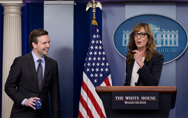Allison Janney, most notably the fake White House Press Secretary C.J. Cregg on the television series “The West Wing”, actually crashed the real White House briefing today while in town for Obama’s “White House Champions of Change” awards.