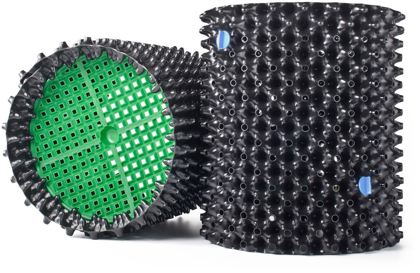 Such an odd looking pot, right? They basically work by guiding the roots towards those holes where they then get pruned. As you can see, the bottom is also vented to prevent roots from circling the bottom of the container. These get shipped to you flat. You just roll them around the bottom disc and attach the fasteners (those blue pieces).
