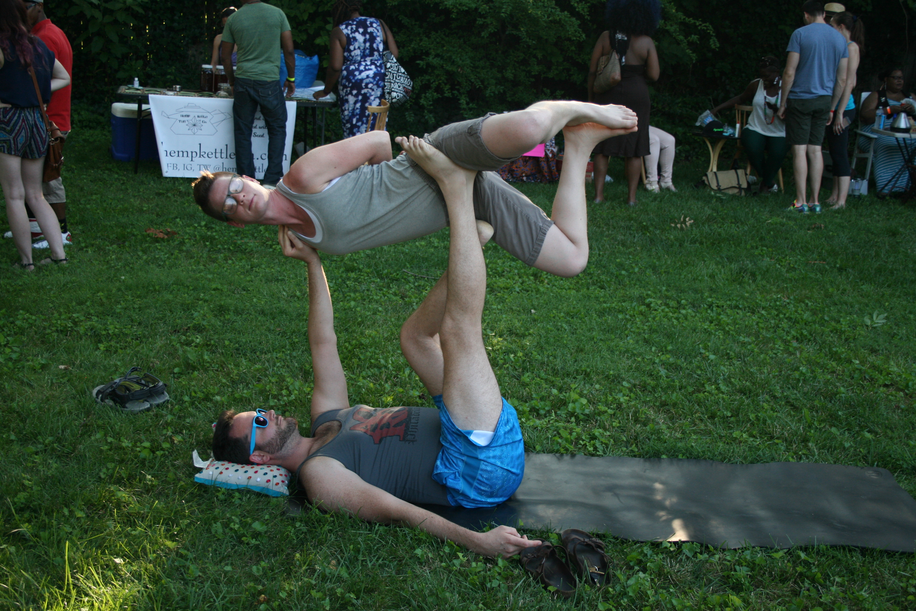 A man and woman practice yoga on the lawn in Washington DC. According to Jessica Rodgers, cannabis may enhance your yoga experience.