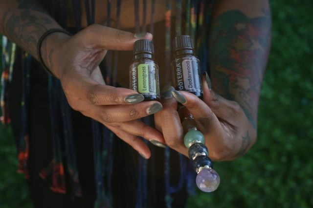 Tarica uses essential oils to help heal. Here she has lemongrass and cedarwood, also pictured is her amulet.
